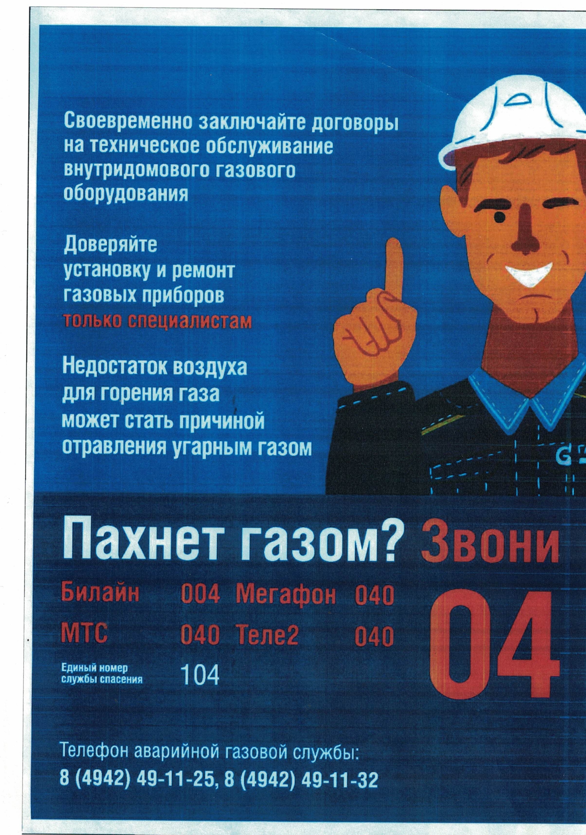 срочно вызовите работающую круглосуточно аварийную газовую службу (телефон 04), если запах газа не исчезает.