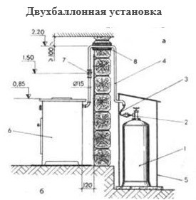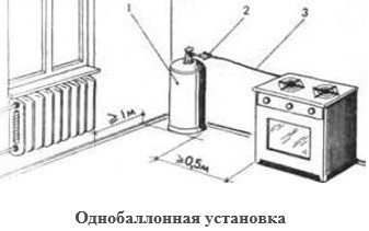-Газовые баллоны для бытовых газовых приборов (в том числе кухонных плит, водогрейных котлов, газовых колонок), за исключением 1 баллона объемом не более 5 литров, подключенного к газовой плите заводского изготовления, располагаются вне зданий в пристройках (шкафах или под кожухами, закрывающими верхнюю часть баллонов и редуктор) из негорючих материалов у глухого простенка стены на расстоянии не менее 5 метров от входов в здание, цокольные и подвальные этажи.