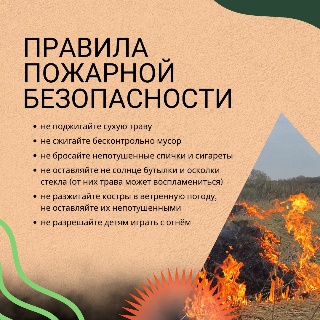 - не оставляйте не затушенных костров, не поджигайте сухую траву – это может привести к пожару.